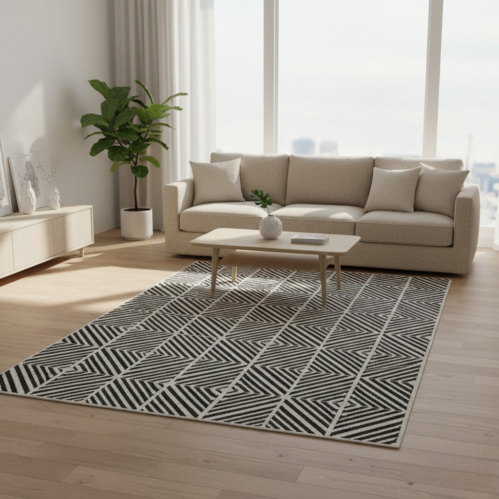 The Monochrome Prism Grid Wool Rug is a refined modern essential designed to bring structure, rhythm, and timeless contrast into your space. Featuring a bold black and ivory geometric pattern composed of repeating diamond and linear prism motifs, this contemporary area rug creates striking visual depth while maintaining a clean, minimalist aesthetic. The sharp symmetry and crisp lines make it a versatile foundation for modern, Scandinavian, transitional, and urban interiors.